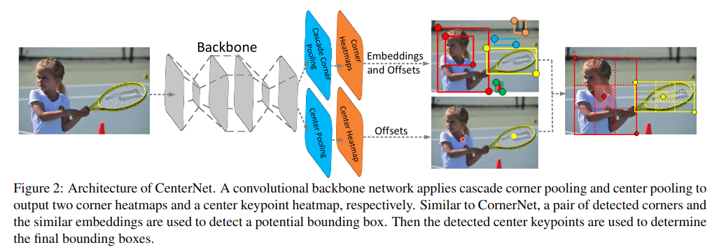 我们分析出了 CornerNet 的问题后,接下来就是找出解决之道,关键问题在于让网络具备感知物体内部信息的能力。一个较容易想到的方法是把 CornerNet 变成一个 two-stage 的方法,即利用 RoI pooling 或 RoI align 提取预测框的内部信息,从而获得感知能力。但这样做开销很大,因此我们提出了用关键点三元组来检测目标,这样使得我们的方法在 one-stage 的前提下就能获得感知物体内部信息的能力。并且开销较小,因为我们只需关注物体的中心,从而避免了 RoI pooling 或 RoI align 关注物体内部的全部信息。
