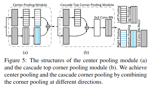 - cascade corner pooling:增加原始的corner pooling感知内部信息的功能。结合了feature map中目标物内部及边界方向的响应值和的最大值来预测角点。经试验证实,此方法在存在feature-level 噪声的情况下更加稳定,有助于准确率及召回率的提升。
